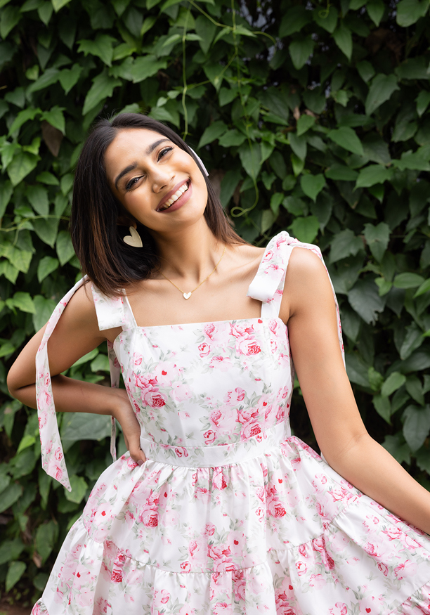 The Nils Kate Pink Short Dress features a gently structured bodice with wide shoulder ties and a flared, tiered skirt that creates a playful yet balanced shape.