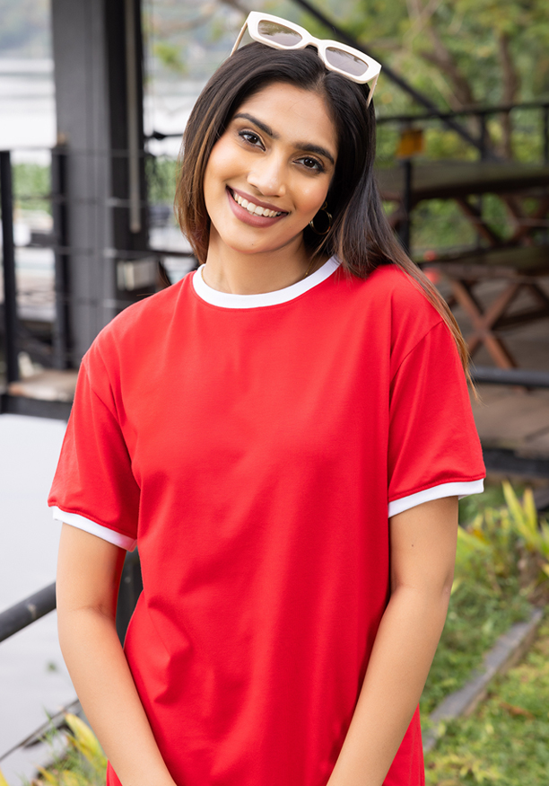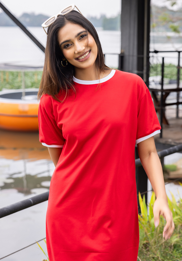 The Nils White Lip Red Dress features a relaxed straight silhouette with contrast white rib detailing at the neckline and sleeves, adding a subtle graphic finish to a bold red base.